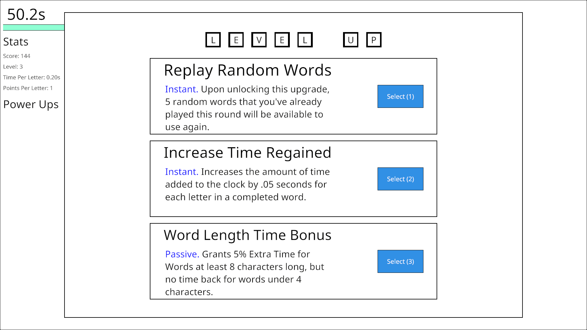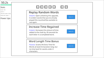 The game starts with a random word. For each letter in the word, aspiring Wizards must come up with their own word that starts with that letter. After all letters have been completed, a new word is chosen. Keep playing until you run out of time! Your score and time limit both increase for every letter in a completed word.